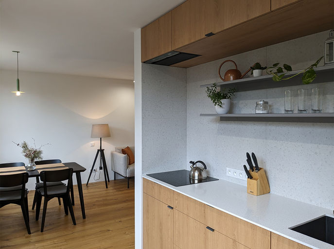 ENG: This is an apartment unit in a block of flats, designed for a young couple. The design changes the internal layout of the central core, which is completely redesigned and offers a better spatial solution for the apartment. The apartment is equipped with custom-made furniture. The furniture is designed especially with a requirement for practicality and visual simplicity. The overall visual style gives the interior what the original panel apartments lack.
